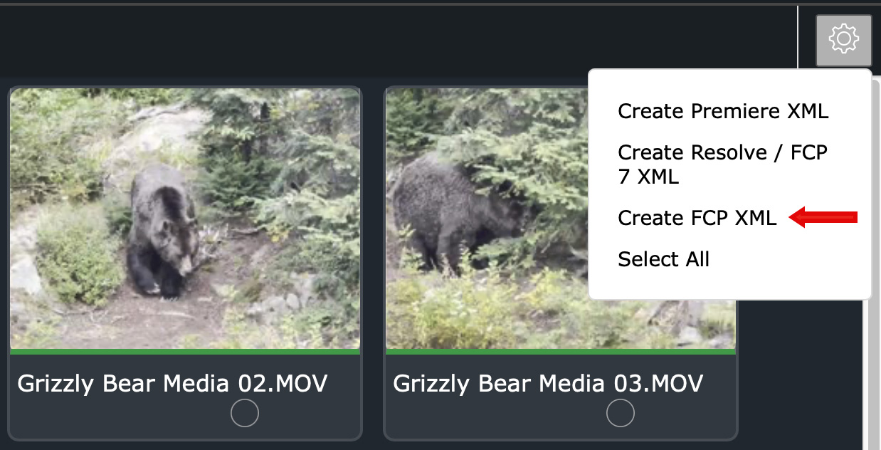 To send these files to FCP (or Premiere or Resolve), open the bin then, from the Gear menu choose Create FCP XML.