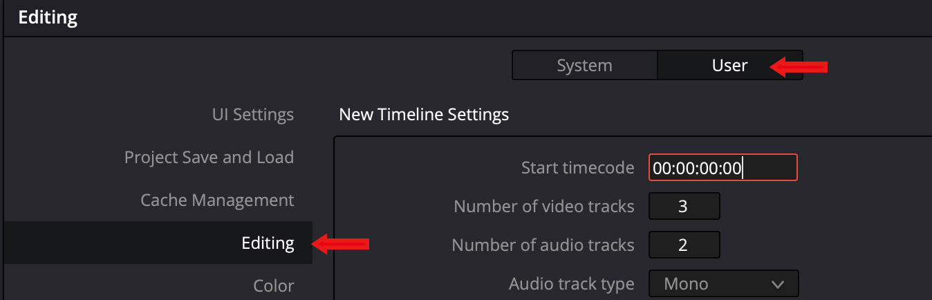 To change the default timecode in Resolve, go to DaVinci Resolve > Preferences > User > Editing. The default timecode is project based.