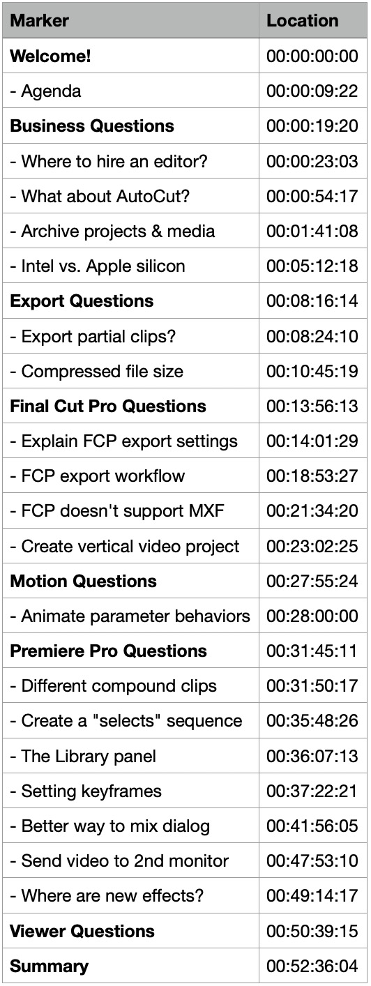This session focused on five key subjects: Business, Export, Apple Final Cut Pro, Motion, and Adobe Premiere Pro. Key questions included: