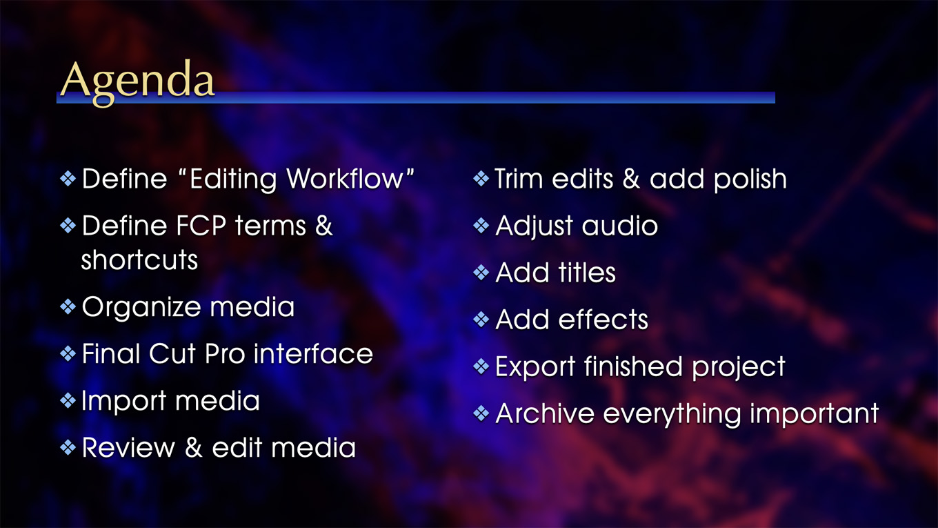 This is an introductory-level session. No Final Cut skills are required to understand this material.