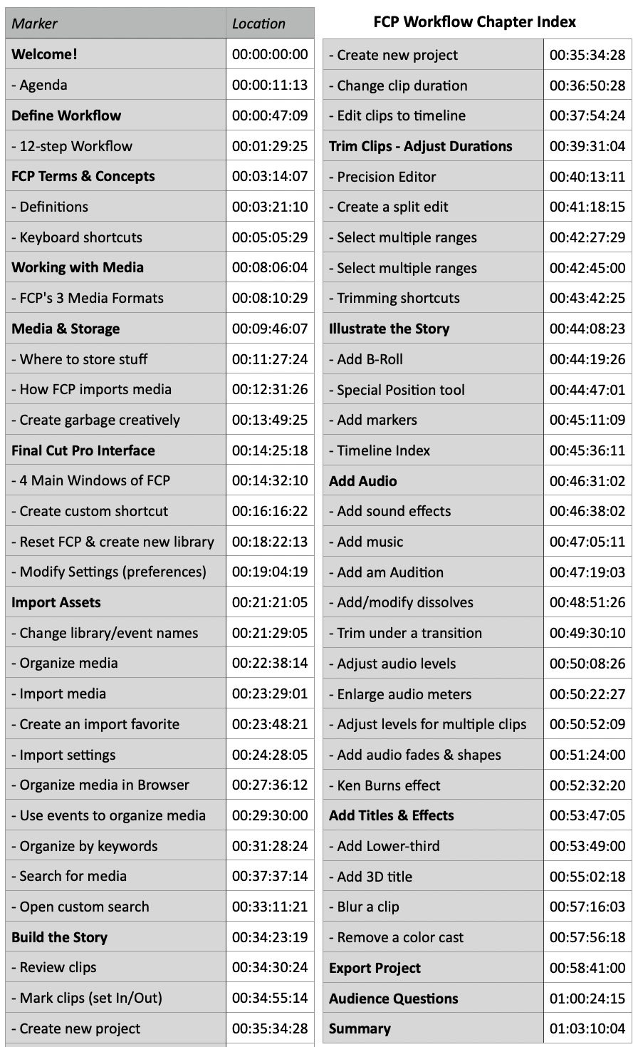 If you are just learning Final Cut, or want to brush up your skills, in this one-hour session you’ll learn everything you need to know; including a ton of useful keyboard shortcuts.